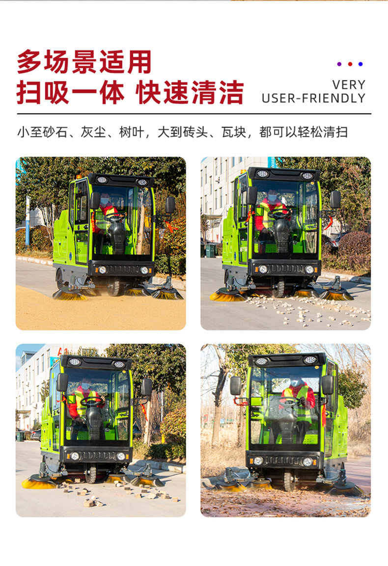 莱特LT-S26型全封闭驾驶式扫地车,清扫宽度2200mm,满电工作时间为4-6小时,工作效率:12000-16000㎡/h,采用的是大品牌铅酸免维护电池。应用场景为:厂区、车间、公园、街道、物业小区、地下车库、停车场、充电站、加油站、码头、学校、机场等区域。